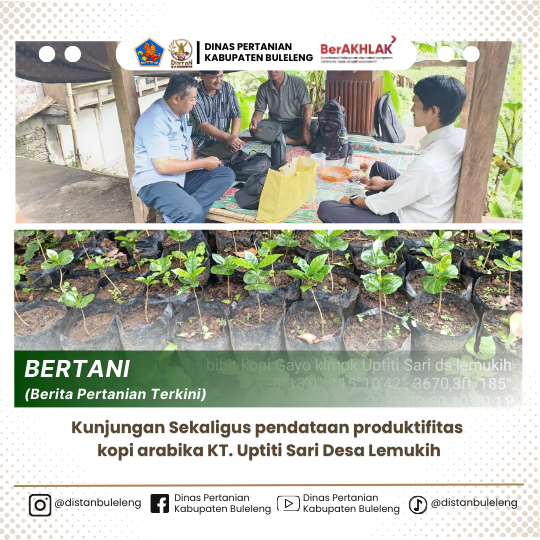 Sesuai dengan surat tugas tanggal 20 Agustus 2025 nomor : B.800.1.11.1/2969/DISTAN/2025 , mengenai pendataan produktifitas kopi arabika di kelompok tani Uptiti Sari Desa lemukih, di lahan milik pribadi seluas 1 ha, didapat produktifitas kopi arabika sebanyak (828,85 kg/ha biji ceri. Produksi kopi Arabica dapat bervariasi tergantung pada beberapa faktor seperti karakteristik lahan, ketinggian tempat,iklim yang mendukung, sistem budidaya dan juga varietas yang ditanam.