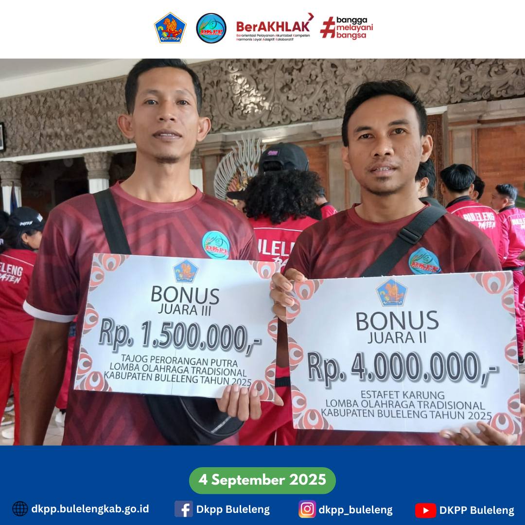 Kamis, 4 September 2025 - Dinas Ketahanan Pangan dan Perikanan (DKPP) Kabupaten Buleleng menghadiri Acara Penyerahan Hadiah Secara Simbolis kepada Para Pemenang Lomba Olahraga Tradisional Tahun 2025 dalam serangkaian HUT Kota Singaraja ke-421, bertempat di Lobby Atiti Wisma Kantor Bupati Buleleng. Hadiah diserahkan langsung oleh Bupati Buleleng, Wakil Bupati Buleleng, Sekda Buleleng, dan jajaran lainnya.