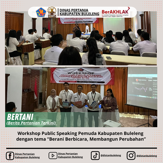 Workshop Public Speaking Pemuda Kabupaten Buleleng dengan tema “Berani Berbicara, Membangun Perubahan” dilaksanakan pada hari terakhir 3 Desember 2025, bertempat di Ranggon Sunset Point Bar & Resto, Buleleng. Dalam kesempatan ini Dinas Pertanian Kabupaten Buleleng diwakili oleh 2 orang Penata Layanan Operasional Bidang Perencanaan. Dalam workshop ini, Kabid Pemuda dan Olahraga, Bapak Pasek Sujendra, membuka sekaligus menutup acara dengan menekankan pada penegasan tujuan kegiatan yaitu membiasakan pemuda, tenaga pendidik, dan pegawai pemerintah agar terbiasa berbicara percaya diri di depan publik sebagai bekal kepemimpinan dan komunikasi profesional.