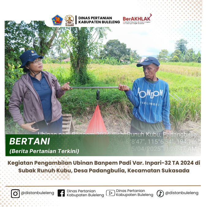 Selasa, 15 April 2025 telah dilaksanakan pengambilan ubinan padi di lahan milik Bapak Nyoman Tinggen dengan luas garapan 0.75 ha, benih Padi Bantuan Pemerintah Varietas Inpari 32 dengan total luas tanam 17 ha yang berlokasi di Subak Runuh Kubu, Desa Padangbulia, Kecamatan Sukasada. Kegiatan ini dilaksanakan oleh Petugas Data Kecamatan Sukasada, PPL Wilbin Desa Padangbulia, Kelian Subak Runuh Kubu dan petani penggarap. Data hasil ubinan yang didapat adalah :