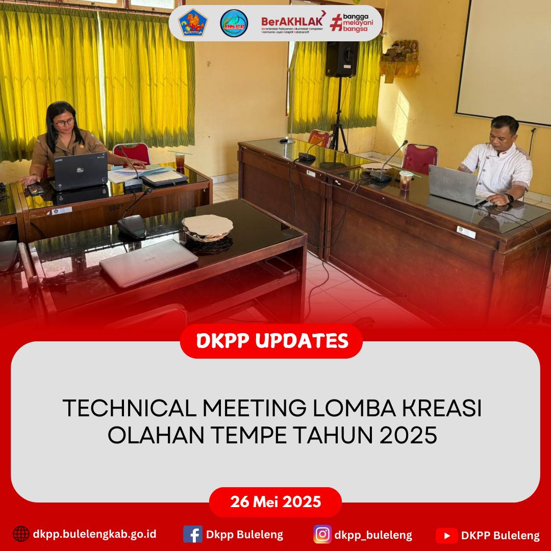 Senin, 26 Mei 2025 - Bertempat di Ruang Rapat Dinas Ketahanan Pangan dan Perikanan (DKPP) Kabupaten Buleleng, diadakan Technical Meeting (TM) Lomba Kreasi Olahan Tempe Tahun 2025 dalam serangkaian Hari Tempe Nasional dan Peringatan Bulan Bung Karno VII.
