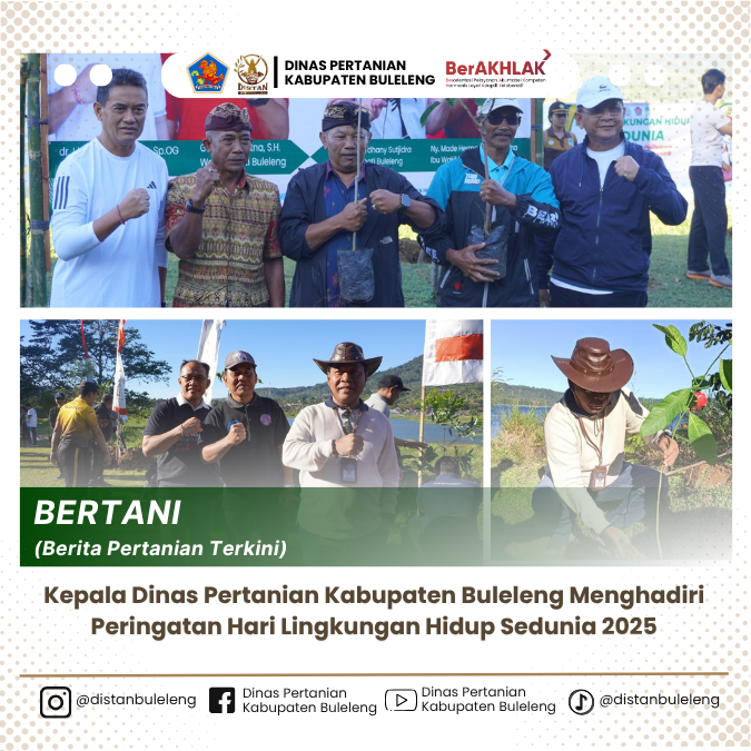 Kepala Dinas Pertanian Kabupaten Buleleng, Gede Melandrat, SP, menghadiri peringatan Hari Lingkungan Hidup Sedunia yang dipusatkan di area parkir Ulun Danu Buyan, Desa Pancasari. Acara ini mengusung tema global “Ending Plastic Pollution: Hentikan Polusi Plastik” sebagai bentuk komitmen bersama dalam menjaga keberlanjutan lingkungan hidup, khususnya di kawasan pertanian dan konservasi air di Kabupaten Buleleng.
