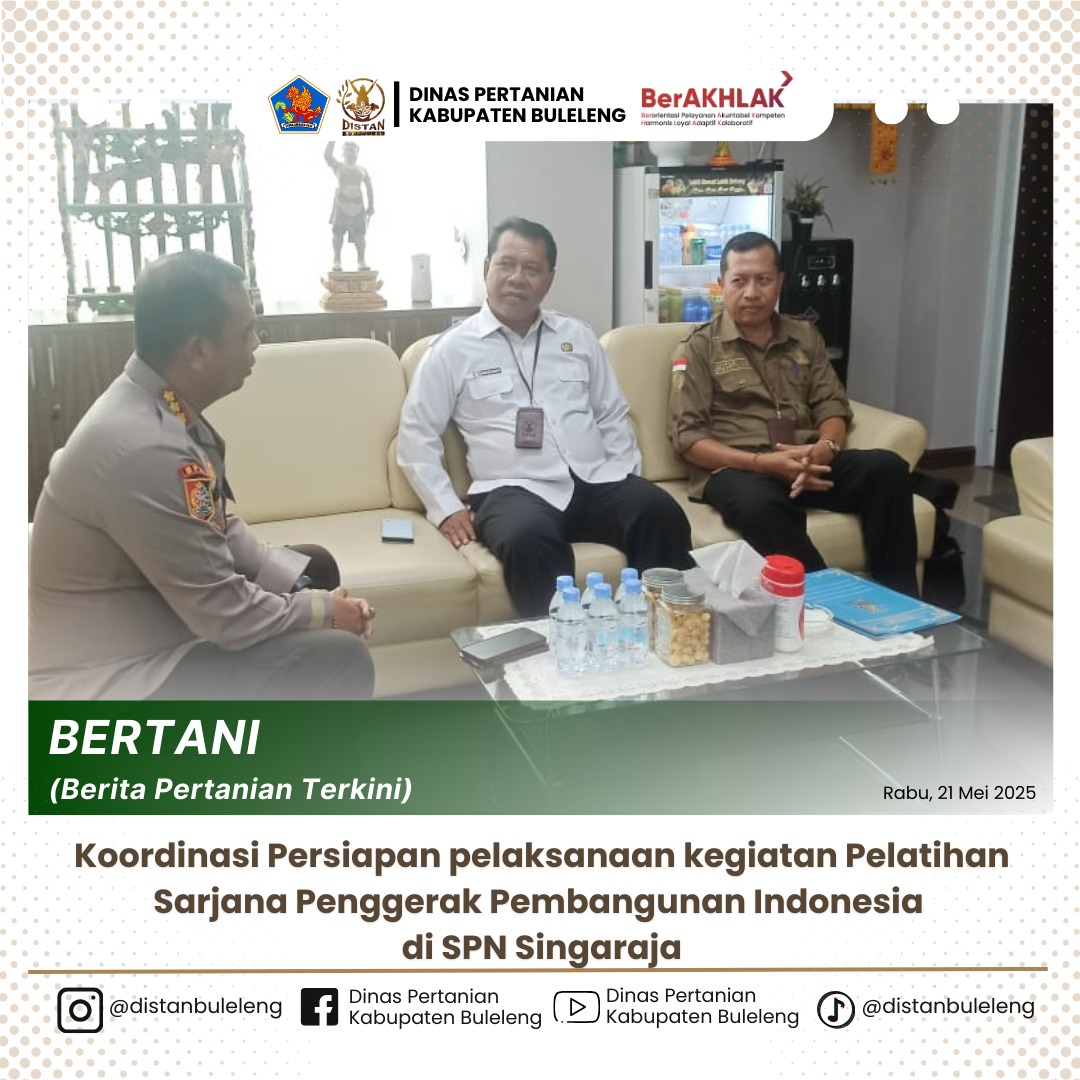 Kepala Dinas Pertanian Kabupaten Buleleng Gede Melandrat,SP didampingi Perencana Ahli Muda Made Sutarman, SE,MAP melaksanakan Koordinasi Persiapan pelaksanaan kegiatan Pelatihan Sarjana Penggerak Pembangunan Indonesia di SPN Singaraja ,diterima langsung oleh Kepala SPN (Sekolah Polisi Negara) Singaraja Polda Bali Kombes Pol. Dewa Putu Eka Darmawan, SIK.,M.H didampingi oleh Bapak Semadi, selanjutnya Kadis Pertanian menjelaskan teknis dan persiapan kegiatan Pelatihan Sarjana Penggerak Pembangunan Indonesia di SPN Singaraja dan lokasi Praktik di lahan Eks Hutan Kota di Kelurahan Banyuasri Singaraja, dan Kepala SPN Singaraja mengatakan bahwa kegiatan pelatihan ini mempunyai tujuan mendidik siswa polisi untuk mengetahui teknik dasar pertanian mulai dari persiapan oleh tanah, pembibitan , pemupukan, penanaman , pemeliharaan serta panen, selain itu karena ini adalah program Presiden maka untuk dapat program ini berhasil, maka dibutuhkan sinergitas dan kolaborasi untuk dapat mensukseskan program Makan Bergisi Geratis (MBG) dan Ketahanan Pangan di Indonesia, kedepan ini akan dibutuhkan suplay sayuran, buah dan daging secara kontinuitas agar program MBG dapat berjalan secara maksimal, selanjutnya Kepala SPN Singaraja juga mengatakan bahwa Narasumber yang dihadirkan selain dari Dinas Pertanian juga akan menghadirkan narasumber dari BPKP, OJK, Bank Indonesia dan pada hari kamis, 21 Mei 2025 , pukul 09.00 wita para narasumber akan di undang ke SPN Singaraja untuk dilibatkan dalam kegiatan (Trainer Training of Trainer" (ToT) adalah pelatihan yang dirancang untuk mempersiapkan seseorang agar mampu menjadi instruktur atau trainer yang handal.