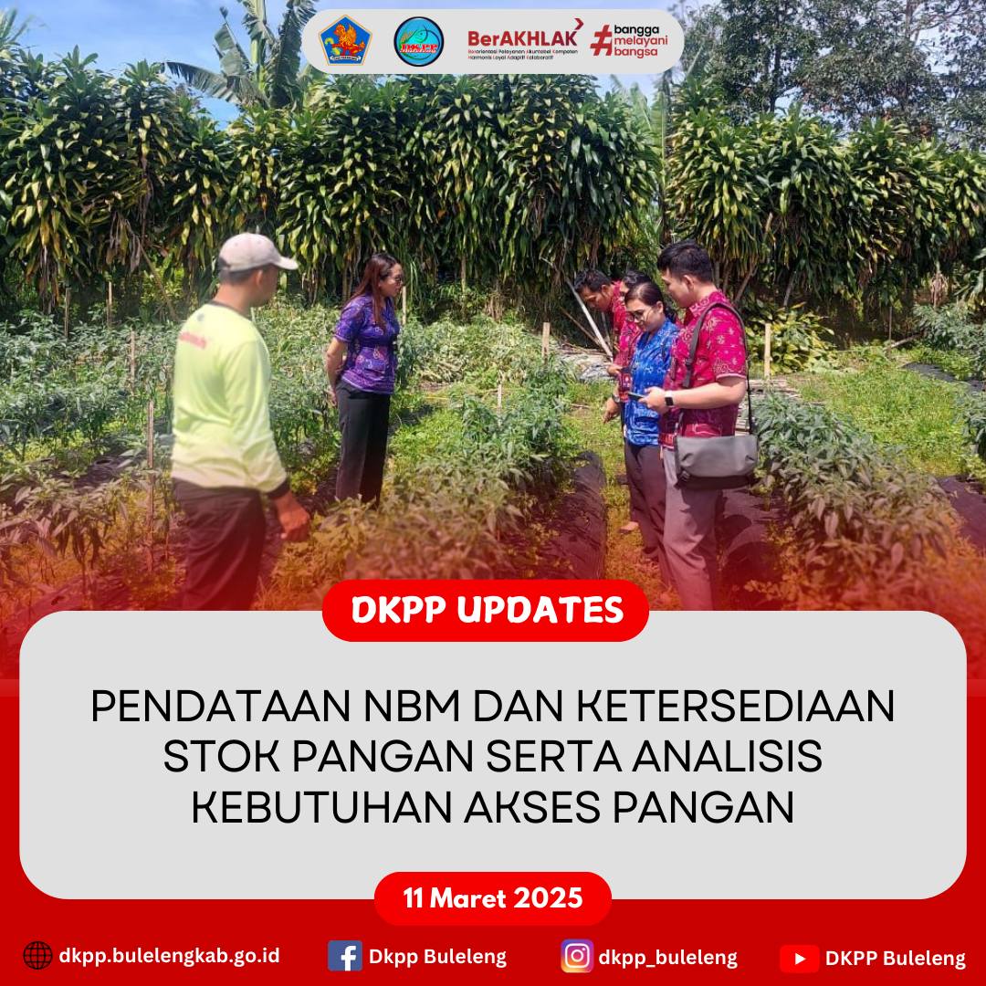 Selasa, 11 Maret 2025 - Dinas Ketahanan Pangan dan Perikanan melaksanakan kegiatan Pendataan Neraca Bahan Makanan dan Ketersediaan Stok Pangan serta Analisis Kebutuhan Akses Pangan di Desa Wanagiri dan Desa Pancasari, Kecamatan Sukasada.