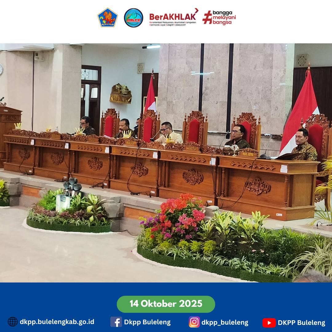 Selasa, 14 Oktober 2025 - Kepala Dinas Ketahanan Pangan dan Perikanan Kabupaten Buleleng I Gede Putra Aryana, S.Sos., MAP. menghadiri Rapat Paripurna DPRD Kabupaten Buleleleng perihal Penyampaian tanggapan dan/atau jawaban Bupati terhadap Pemandangan Umum Fraksifraksi DPRD atas Ranperda tentang Perubahan Kelima atas Perda No. 13 Tahun 2016 tentang Pembentukan dan Susunan Perangkat Daerah, bertempat di Ruang Sidang DPRD Buleleng.