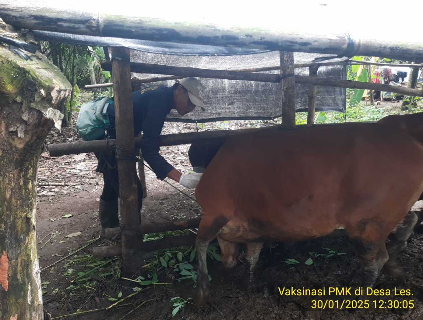 Dalam rangka mengantisifasi penyebaran penyakit mulut dan kuku (PMK) dokter hewan Kecamatan Tejakula (drh I Gede Suarsadana bersama PPL wilbin Les dan Pacung (I Gede Carmaka, SP) melakukan vaksinasi PMK di Desa Les Kamis, 30 Januari 2025.
