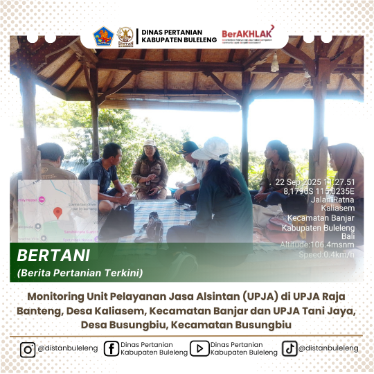 Senin, 22 September 2025 telah dilaksanakan monitoring Unit Pelayanan Jasa Alsintan (UPJA) yang berlokasi di UPJA Raja Banteng, Desa Kaliasem, Kecamatan Banjar dan UPJA Tani Jaya, Desa Busungbiu, Kecamatan Busungbiu. Kegiatan ini dihadiri oleh tim Dinas Pertanian dan Ketahanan Pangan Provinsi Bali Bidang Sumber Daya Pertanian bersama dengan Bidang Prasarana dan Sarana Pertanian Kabupaten Buleleng.