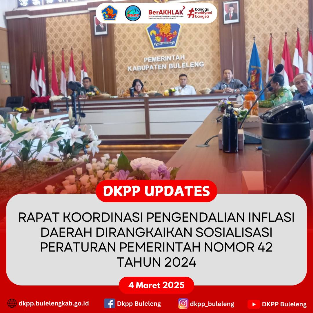 Selasa, 4 Maret 2025 - Bertempat di Ruang Rapat Kantor Bupati Buleleng, Dinas Ketahanan Pangan dan Perikanan (DKPP) Kabupaten Buleleng mengikuti Zoom Meeting Rapat Koordinasi (Rakor) Pengendalian Inflasi Daerah yang dirangkaikan Sosialisasi Peraturan Pemerintah nomor 42 Tahun 2024 tentang Penyelenggaraan Bidang Jaminan Produk Halal. Rakor ini dipimpin oleh Menteri Dalam Negeri Republik Indonesia dengan melibatkan unsur terkait dari kementerian/lembaga hingga instansi Pemerintah Daerah.