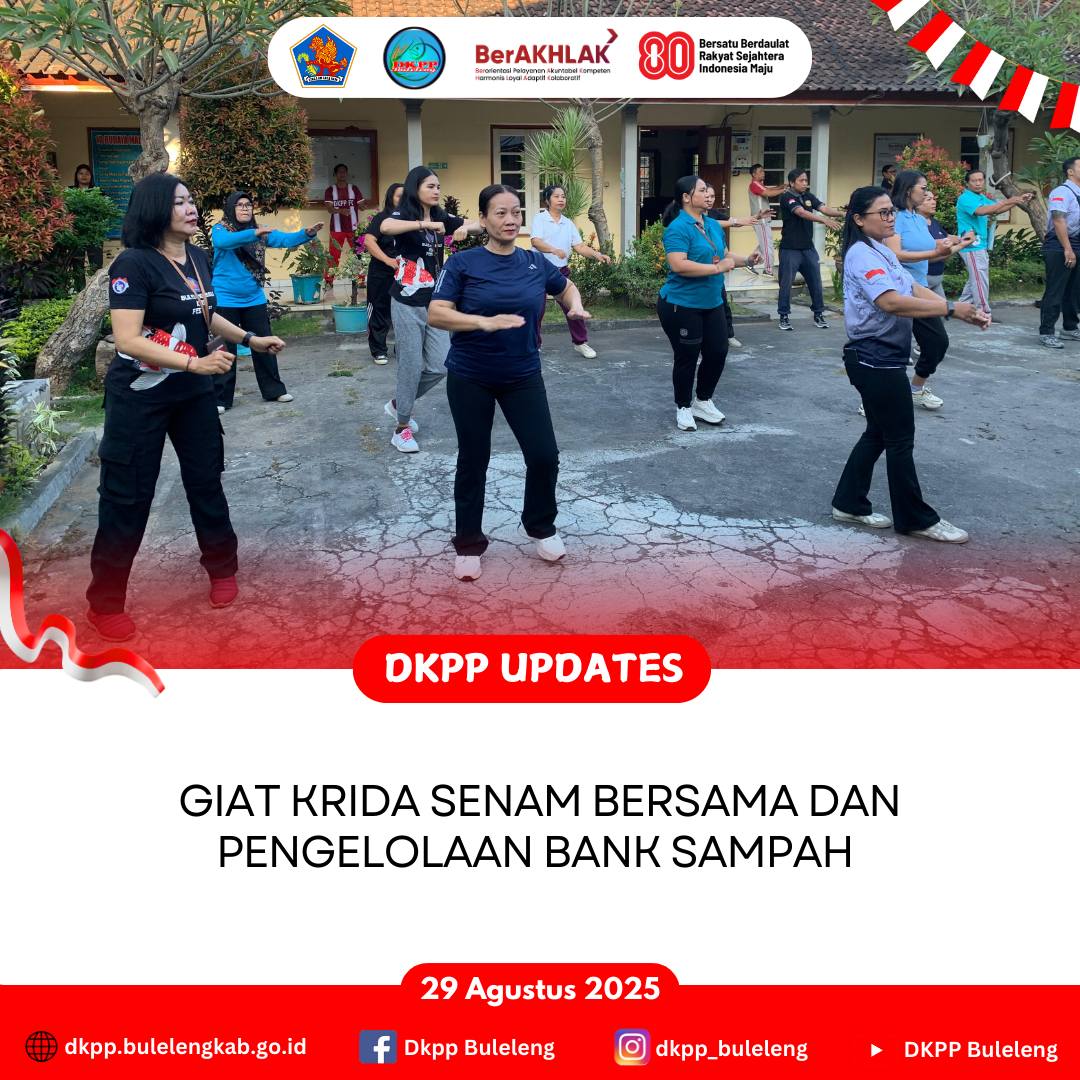 Jumat, 29 Agustus 2025 - Dinas Ketahanan Pangan dan Perikanan (DKPP) Kabupaten Buleleng melaksanakan Giat Krida dengan melakukan senam bersama sebagai upaya menjaga kebugaran dan imun tubuh, kemudian dilanjutkan dengan Teknis Pengelolaan Bank Sampah Unit Nafas Dunia dalam bentuk pengumpulan, pemilahan, serta penimbangan terhadap sampah plastik, kertas, dan kaca.