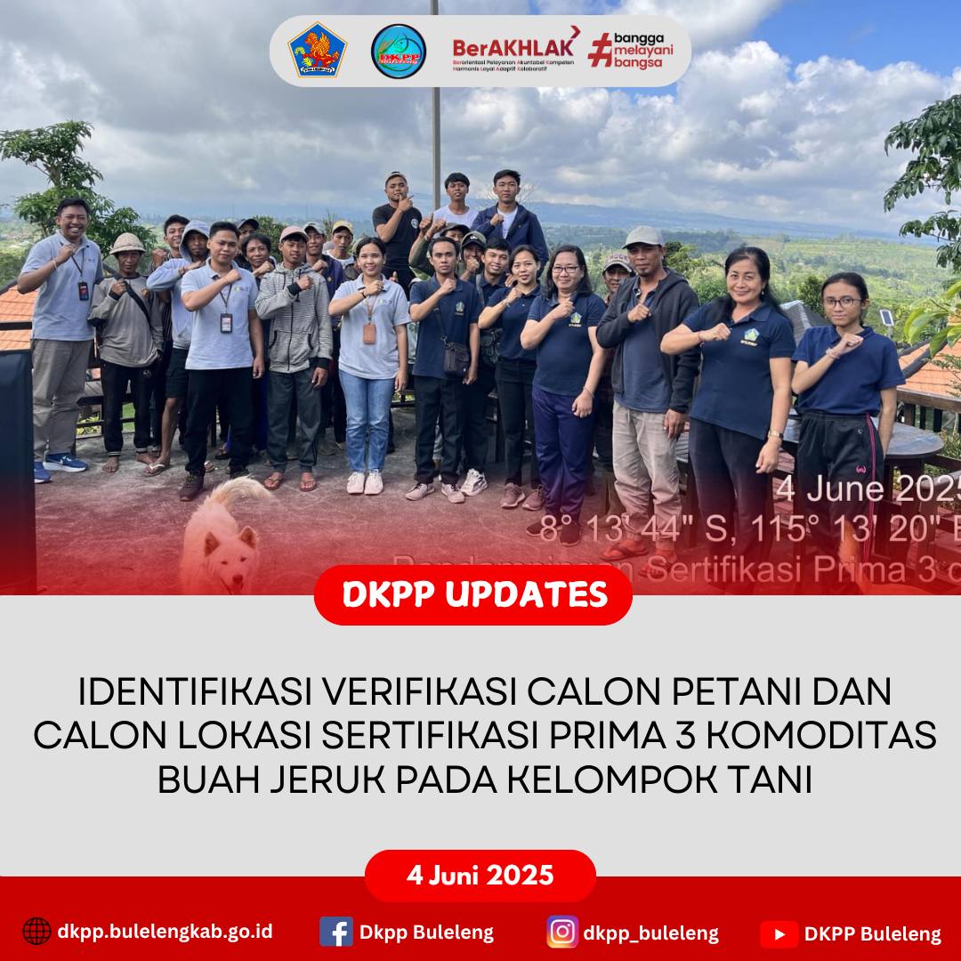 Rabu, 4 Juni 2025 - Dinas Ketahanan Pangan dan Perikanan (DKPP) Kabupaten Buleleng melalui Bidang Penganekaragaman Konsumsi dan Keamanan Pangan mendampingi Tim Balai Sertifikasi Mutu dan Keamanan Pangan - Dinas Pertanian dan Ketahanan Pangan Provinsi Bali dalam melaksanakan kegiatan Identifikasi Verifikasi Calon Petani dan Calon Lokasi (CPCL) Sertifikasi Prima 3 Komoditas Buah Jeruk pada Kelompok Tani Ternak Lumbung Sari, Desa Tambakan, Kecamatan Kubutambahan.