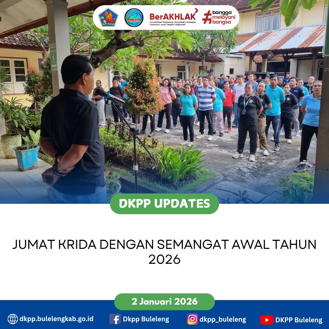 Giat Krida Dinas Ketahanan Pangan dan Perikanan (DKPP) Kabupaten Buleleng, diawali Apel Krida dengan beberapa pengarahan oleh Plt. Kepala Dinas Gede Melandrat, SP. kemudian dilanjutkan senam aerobik guna menjaga kebugaran serta meningkatkan imun tubuh. (02/01)