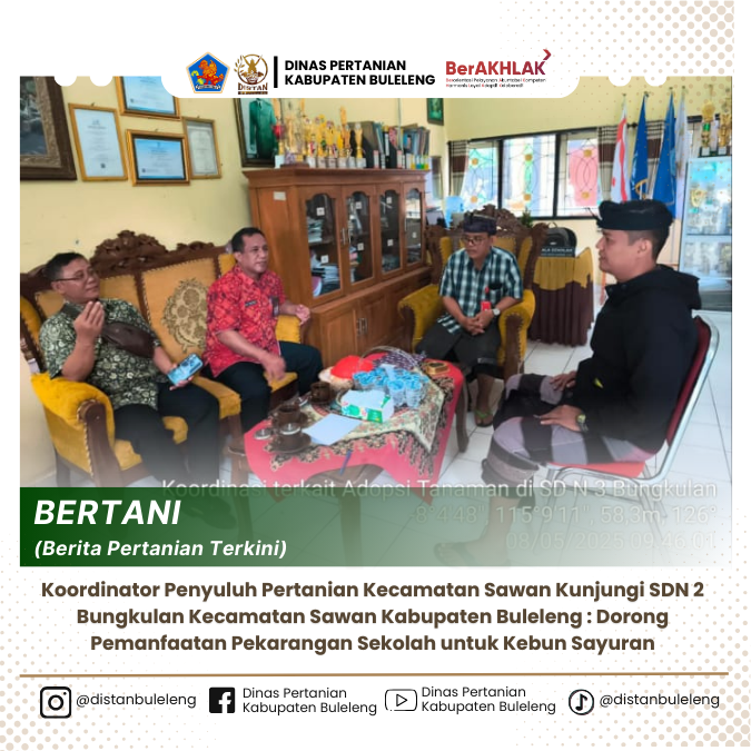 Koordinator Penyuluh Pertanian Kecamatan Sawan, Bapak Drh Km Widiarnawan, melakukan kunjungan kerja ke SD Negeri 2 Bungkulan dalam rangka memberikan penyuluhan sekaligus pendampingan teknis pemanfaatan lahan pekarangan sekolah untuk budidaya tanaman sayuran, Kamis (8/5).