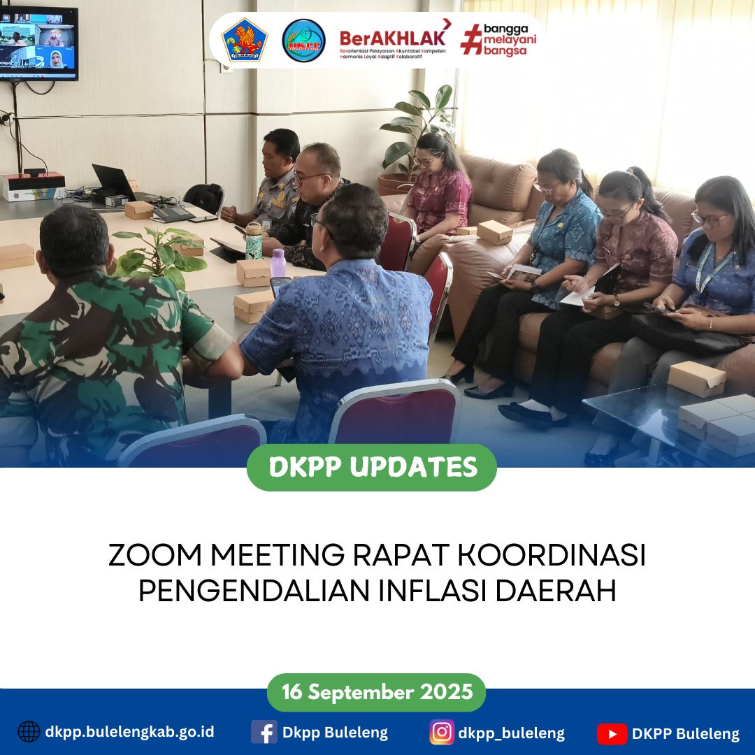 Selasa, 16 September 2025 - Dinas Ketahanan Pangan dan Perikanan (DKPP) Kabupaten Buleleng mengikuti Zoom Meeting Rapat Koordinasi Pengendalian Inflasi Daerah yang melibatkan unsur kementerian/lembaga, serta Pemerintah Daerah setingkat Provinsi dan Kabupaten/Kota.