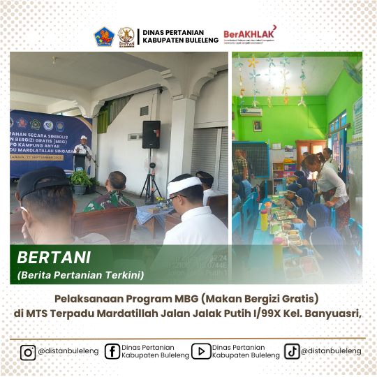 Senin 22 September 2025, menghadiri Pelaksanaan Program MBG (Makan Bergizi Gratis) di MTS Terpadu Mardatillah Jalan Jalak Putih I/99X Kel. Banyuasri, melalui Satuan Pelayanan Pemenuhan Gizi (SPPG) Kampung Anyar untuk mendukung Program MBG, merupakan respon langsung terhadap tantangan malnutrisi di Indonesia yaitu kekurangan zat gizi mikro. Data tahun 2022 mencatat bahwa 32% anak Indonesia mengalami anemia, 41% tidak sarapan, dan 58% memiliki pola makan tidak sehat, terutama pada kelompok rentan di fase emas pertumbuhan. Dengan menu MBG disusun berdasarkan prinsip “Isi Piringku” dan memenuhi 25–35% kebutuhan gizi harian. Program ini diawasi langsung oleh Badan Gizi Nasional, pemerintah daerah, dan sistem digital nasional untuk menjamin transparansi dan akuntabilitas. Di Kabupaten Buleleng sampai minggu IV September 2025 ini terdapat 10 SPPG tersebar di 5 Kecamatan (Buleleng, Sukasada, Banjar, Busungbiu, Tejakula). plt Kepala Dinas Pendidikan, Pemuda dan Olahraga Kab. Buleleng mewakili Bupati Buleleng, dalam sambutannya menyampaikan bahwa Pemerintah Kabupaten Buleleng mengakselerasi pelaksanaan Program Makan Bergizi Gratis (MBG) yang ditetapkan Presiden Prabowo Subianto sebagai program prioritas nasional melalui dapur komunitas gizi (SPPG) aktif, menyasar anak sekolah, balita, ibu hamil dan menyusui, serta santri di pesantren dan sekolah keagamaan. Selain menyediakan makanan bergizi, program ini juga telah membuka lapangan kerja baru, serta menggandeng UMKM, petani, nelayan, dan koperasi lokal dalam ekosistem pelaksanaannya. Di samping manfaat gizi dan kesehatan, MBG turut memperkuat ketahanan ekonomi melalui pengurangan beban pengeluaran rumah tangga dan stabilisasi harga pangan lewat pembelian langsung dari produsen rakyat.