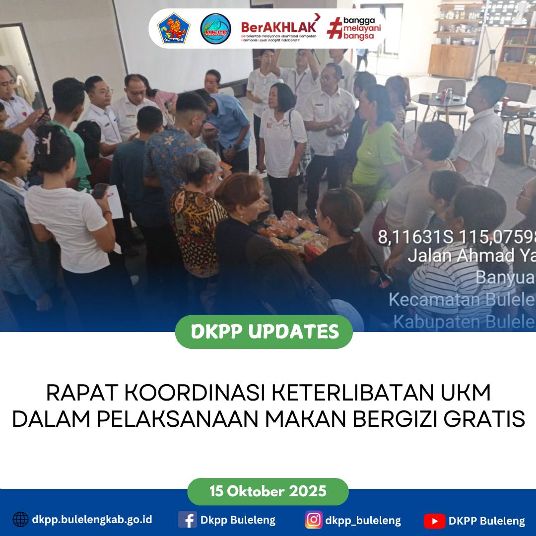 Rabu, 15 Oktober 2025 - Sekretaris Dinas Ketahanan Pangan dan Perikanan Kabupaten Buleleng Ariston Adhi Pamungkas, S.P., M. Env Man. bersama staf terkait menghadiri Rapat Koordinasi Dukungan UKM yang berlangsung di Gedung PLUT K-UMKM Buleleng, pertemuan di hadiri oleh BGN Koordinator Wilayah Buleleng beserta wakilnya, Dagperinkopukm, DKPP, Distan dan 0ara pelaku UKM Olahan Pangan.