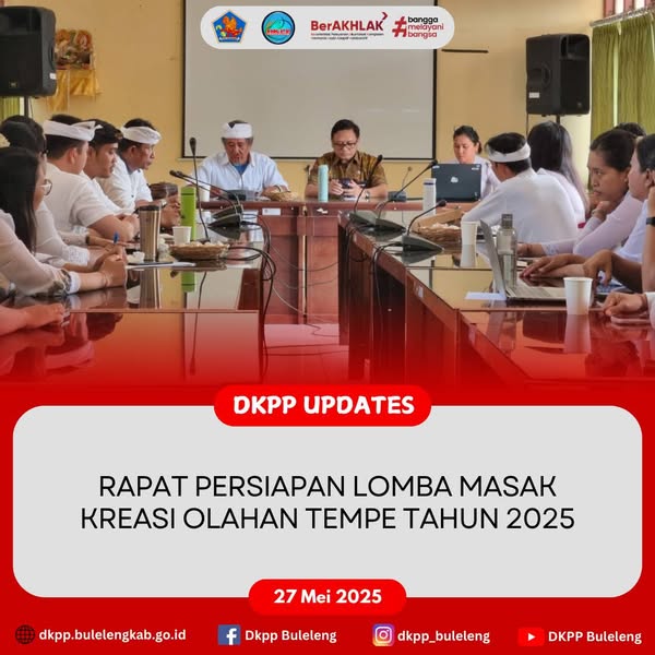 Selasa, 27 Mei 2025 - Bertempat di Ruang Rapat Dinas Ketahanan Pangan dan Perikanan (DKPP) Kabupaten Buleleng, diadakan Rapat Persiapan Lomba Masak Kreasi Olahan Tempe Tahun 2025 yang dipimpin Sekretaris Dinas Ariston Adhi Pamungkas, S.P., M. Env Man. didampingi Kabid Ketersediaan dan Kerawanan Pangan serta Analis Ketahanan Pangan, dan juga dihadiri jajaran yang masuk dalam Panitia Perlombaan.