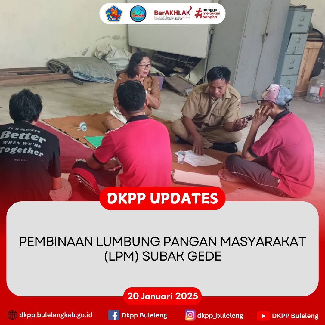 Senin, 20 Januari 2025, Dinas Ketahanan Pangan dan Perikanan (DKPP) Kabupaten Buleleng melalui Bidang Distribusi dan Cadangan Pangan melaksanakan pembinaan kepada Lumbung Pangan Masyarakat (LPM) Subak Gede, Desa/Kecamatan Gerokgak. Kegiatan dihadiri Analis Ketahanan Pangan (Nyoman Sukerni, S.H., M.Pd.) bersama staf terkait, serta para pengurus dan anggota LPM.