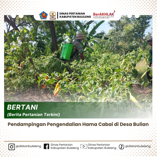 Upaya pengendalian Organisme Pengganggu Tanaman (OPT) pada tanaman cabai kembali dilaksanakan di Kelompok Tani Ternak (KTT) Tri Nadi, Desa Bulian, Kecamatan Kubutambahan. Kegiatan pendampingan intensif ini dilaksanakan pada hari Kamis 10 Juli oleh Penyuluh Pertanian Lapangan (PPL) Desa Bulian bersama Pengendali Organisme Pengganggu Tumbuhan (POPT) Kecamatan Kubutambahan.