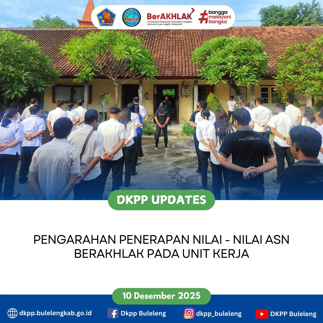 Pengarahan Penerapan Nilai - Nilai ASN BerAKHLAK (Berorientasi Pelayanan, Akuntabel, Kompeten, Harmonis, Loyal, Adaptif, dan Kolaboratif) meliputi integritas dalam penegakan disiplin jajaran ASN oleh Plt. Kepala Dinas Ketahanan Pangan dan Perikanan Kabupaten Buleleng Gede Melandrat, SP. pada Apel bersama. Rabu (10/12)