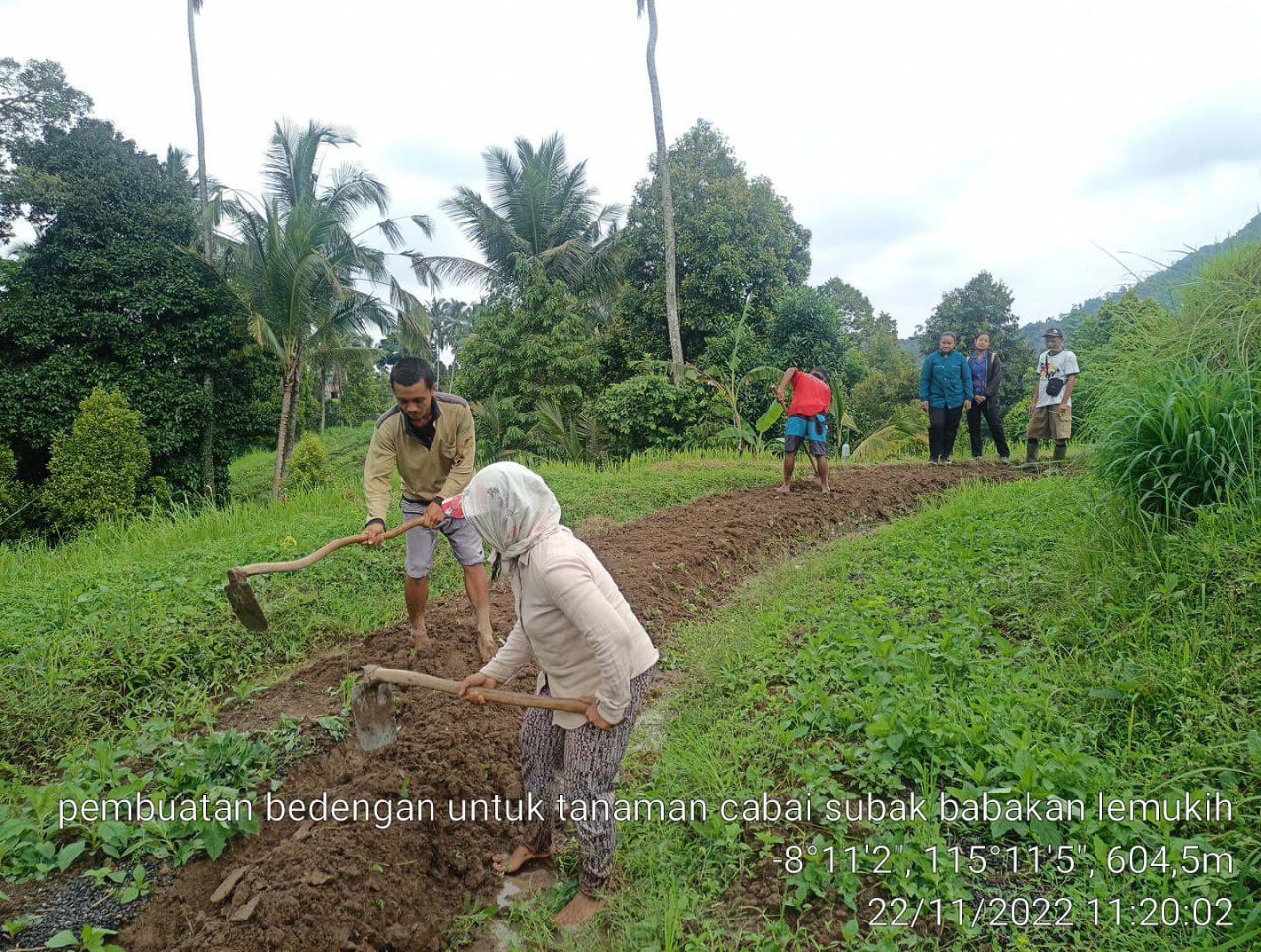 Bedengan adalah area tanam atau tempat tumbuh tanaman yang sudah diolah. Pada hari ini Selasa, 22 November 2022 PPL Wilbin Desa Lemukih melakukan pendampingan pembuatan bedengan oleh Bapak Ketut Kanaya di Subak Babakan Lemukih untuk budidaya tanaman cabai seluas 0.5 ha. Tahapan yang dilakukan pertama kali yaitu menggemburkan tanah dengan cara mencangkul dengan kedalaman kurang lebih 25 cm. Kedalaman tersebut bertujuan agar tanah menjadi gembur hingga kedalam tanah dan untuk memudahkan perkembangan akar tanaman sehingga dapat tumbuh. Ukuran bedengan pada lahan cabai biasanya memiliki lebar 100 cm. panjangnya disesuaikan dengan kondisi tanah, tinggi bedengan kurang lebih 20 cm dan jarak antar bedengan 50 cm. Penentuan jarak tersebut bertujuan agar jarak antara bedeng tetap rapi dan tidak terlalu dekat sehingga jarak tersebut bisa dijadikan tempat untuk berjalan. Fungsi bedengan tersebut adalah untuk memudahkan pembuangan air hujan, melalui selokan, memudahkan meresapnya air hujan maupun air penyiraman ke dalam tanah serta memudahkan untuk proses pemeliharaan tanaman.