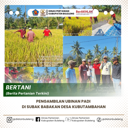 Pada hari ini, Jumat 8 Agustus 2025, dilaksanakan kegiatan Pengambilan ubinan Padi di Subak Paitan Desa Pakisan, sebagai kegiatan rutin dalam pengukuran produktivitas dan produksi padi sebagai upaya turut serta mendukung tercapainya target produksi padi sebagai bagian penting dari Swasembada Pangan. Kegiatan ini dilakukan oleh Petugas Lapangan ( PPL Wilbin) dan Petugas Data Kecamatan Kubutambahan dalam rangka untuk mengetahui Jumlah Rata - Rata Produksi Padi di Wilayah Kecamatan Kubutambahan, khususnya untuk wilbin Pakisan. Berdasarkan pengukuran hari ini yg dilakukan secara random pada lahan milik petani bernama Ketut Serama sesuai prosedur pengambilan plot ubinan standar BPS pada Panen padi Varietas Inpari IR Nutri Zinc diperoleh hasil Ubinan sebesar 4,265 Kg. dengan produktivitas 68,24 Kw/Ha GKP. Luas Tanaman yang dipanen saat ini adalah seluas 0,25 Ha, sehingga bisa di estimasi bahwa produksi panen padi tersebut sebesar 1,44 ton GKG.