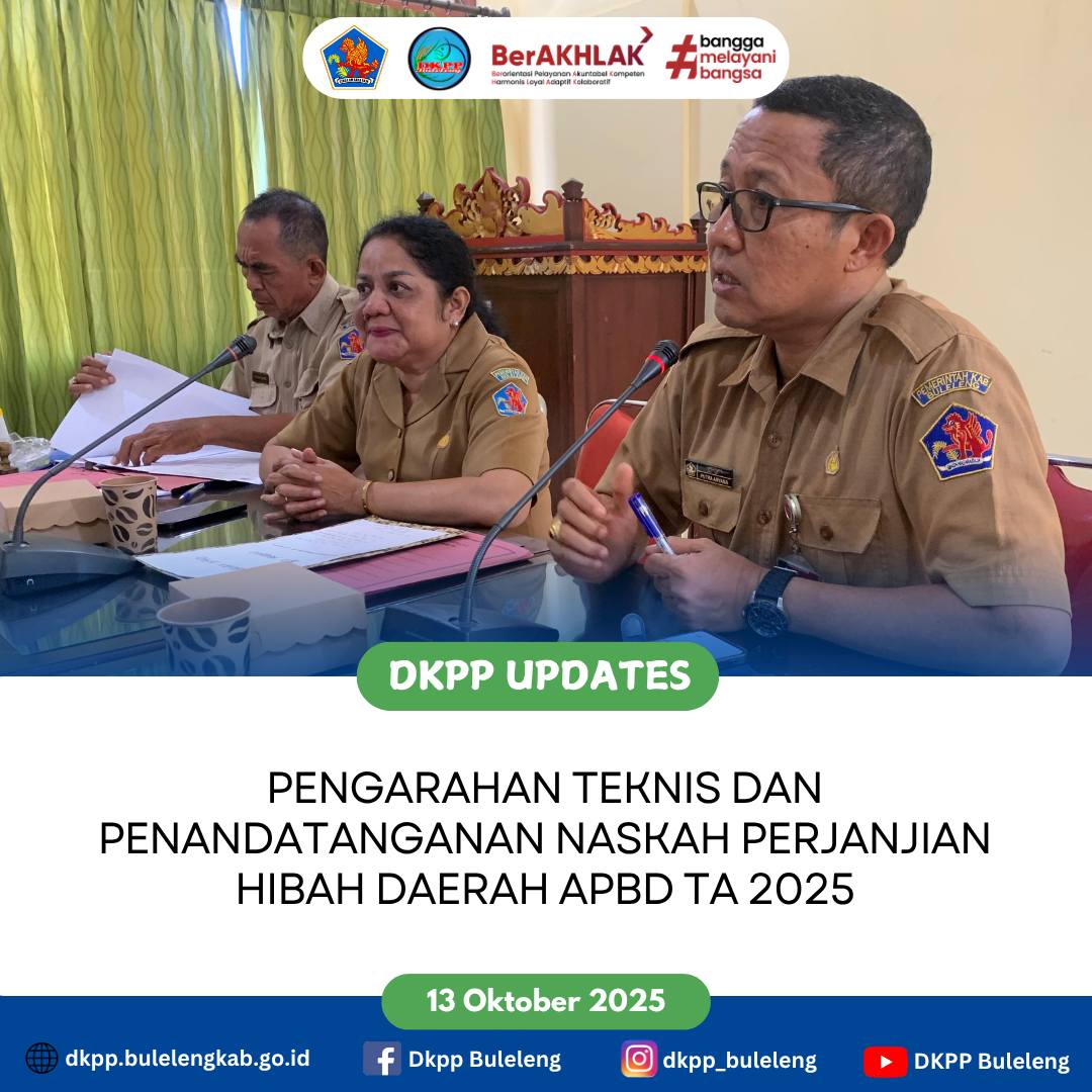 Senin, 13 Oktober 2025 - Dinas Ketahanan Pangan dan Perikanan (DKPP) Kabupaten Buleleng memfasilitasi Kelompok Usaha Bersama (KUB) dalam Pengarahan Teknis dan Penandatanganan Naskah Perjanjian Hibah Daerah (NPHD) bagi penerima Bantuan Hibah yang bersumber dari APBD Kabupaten Buleleng Tahun Anggaran 2025, dengan berlandaskan Peraturan Bupati Buleleng Nomor 51 Tahun 2022 tentang Tata Cara Penganggaran, Pelaksanaan dan Penatausahaan, Pertanggungjawaban dan Pelaporan, serta Monitoring dan Evaluasi Hibah dan Bantuan Sosial. Kegiatan dipimpin langsung oleh Kadis DKPP Buleleng I Gede Putra Aryana, S.Sos., MAP. yang didampingi pejabat terkait, serta dihadiri perwakilan kelompok Nelayan penerima bantuan terdiri dari KUB Segara Timbul Desa Tejakula, KUB Segara Waringin Desa Pacung, KUB Bunga Indah Desa Sumbeklampok.