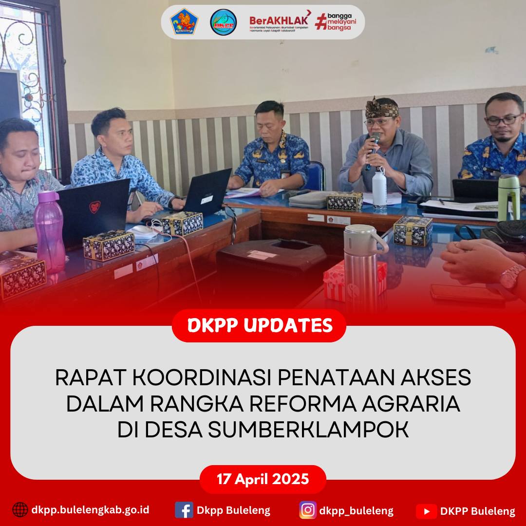 Kamis, 17 April 2025 - Sekretaris Dinas Ketahanan Pangan dan Perikanan Kabupaten Buleleng Ariston Adhi Pamungkas, S.P., M. Env Man. mewakili Kepala Dinas menghadiri Rapat Koordinasi Penataan Akses dalam rangka Reforma Agraria untuk Masyarakat Eks Tim-Tim di Desa Sumberkelampok, Kec. Gerokgak yang berlangsung di Ruang Rapat Dinas Perkimta Kabupaten Buleleng. Hadir dalam kesempatan ini adalah perwakilan dari Dinas PUPR Provinsi Bali, instansi Perangkat Daerah lingkup Pemkab Buleleng terkait, Camat Gerokgak, Perbekel Sumberklampok, Anggota Tim Gugus Tugas Reforma Agraria (GTRA) dan undangan lainnya.