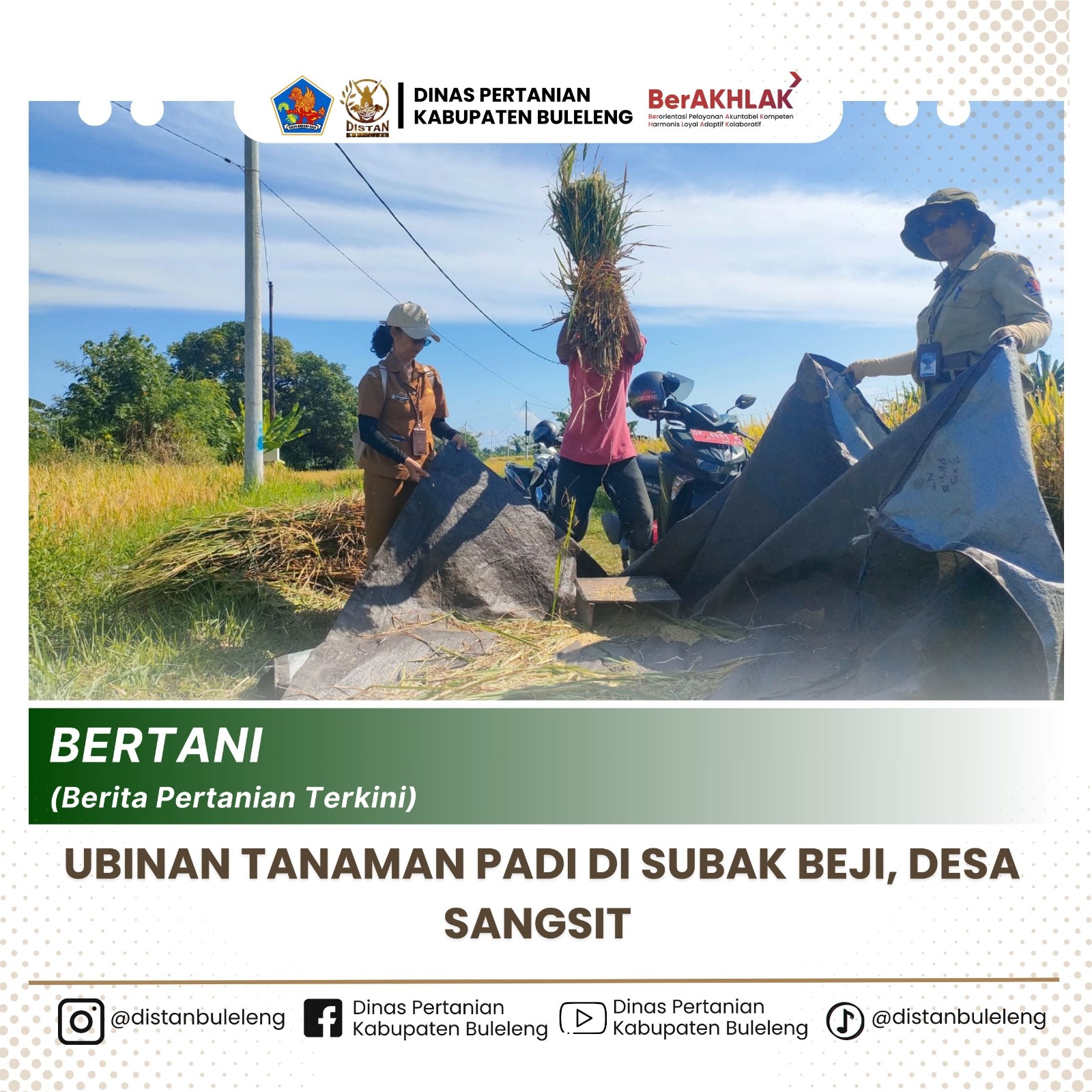 Senin, 5 Mei 2025 dilaksanakan kegiatan pengambilan ubinan tanaman padi dengan varietas Ciherang di Subak Beji, Desa Sangsit. Kegiatan ini dihadiri oleh Kepala Bidang Tanaman Pangan beserta staf, PPL Wilbin Sangsit, POPT Kec. Sawan, Babinsa Sangsit dan petani.