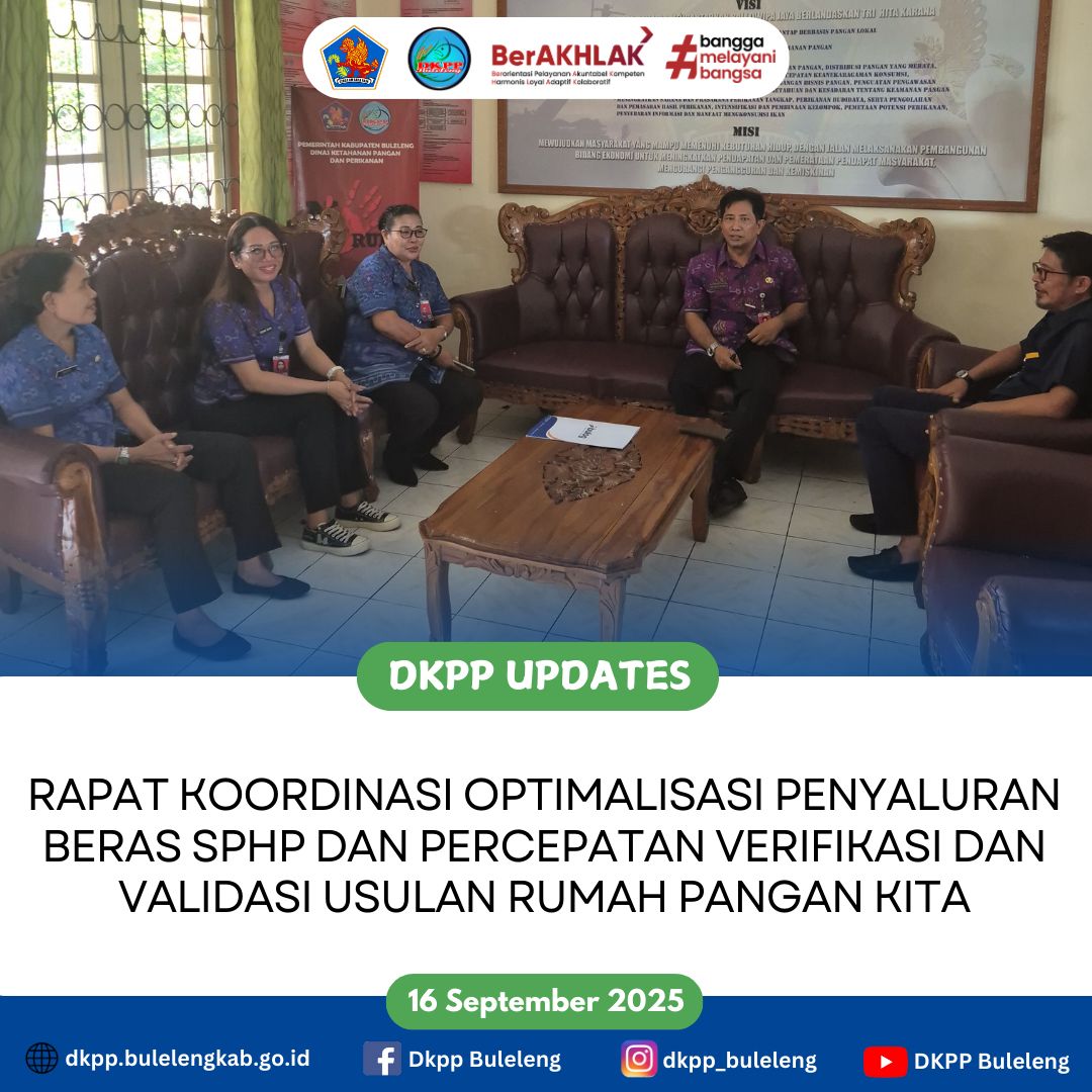 Dinas Ketahanan Pangan dan Perikanan (DKPP) Kabupaten Buleleng menggelar Rapat Koordinasi bersama Perum. BULOG dalam rangka optimalisasi penyaluran Beras SPHP serta untuk kebutuhan percepatan verifikasi dan validasi terhadap usulan Rumah Pangan Kita (RPK). (16/9)