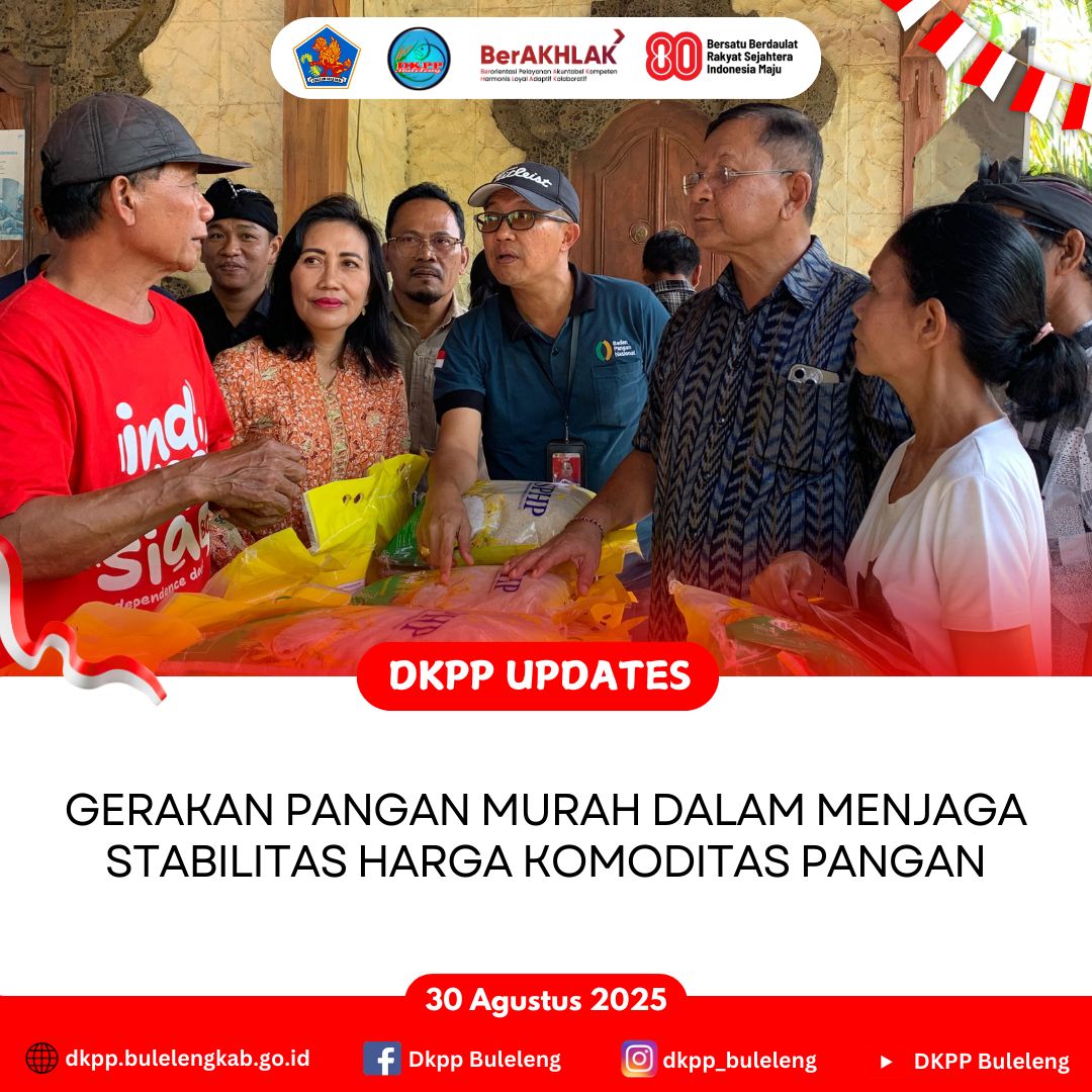 Sabtu, 30 Agustus 2025 - Dinas Ketahanan Pangan dan Perikanan (DKPP) Kabupaten Buleleng mengikuti dan memfasilitasi Pelaksanaan Gerakan Pangan Murah (GPM) dalam rangka menjaga stabilitas harga komoditas pangan sekaligus memeriahkan HUT Kemerdekaan Republik Indonesia ke-80.