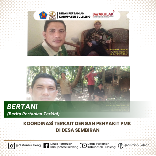 Pada hari ini,Selasa 22 Juli 2025 bertempat di Kantor Desa Sembiran PPL Desa Sembiran melakukan koordinasi dengan Perbekel desa Sembiran terkait dengan laporan dari warga ada beberapa sapi yang sakit dan mati yang diduga terindikasi PMK. Pada saat kordinasi disampaikan oleh perbekel Desa Sembiran sapi yang mati dengan ciri-ciri yang mengarah ke PMK.