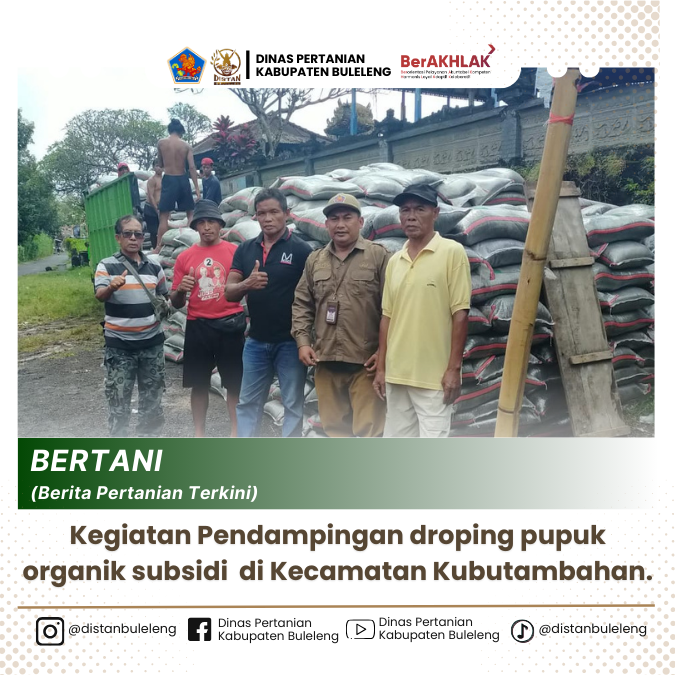 Pada hari ini Senin,Tanggal 5 Mei 2025, telah dilaksanakan kegiatan pendampingan droping pupuk organik bersubsidi di subak Paitan Desa Pakisan, Subak Lanyahan dan Kudungan Desa Bontihing,Subak Babakan dan Lanyahan Desa Tamblang, dengan jumlah yang akan diterima Sebanyak, Subak Paitan Pakisan 7.000 Kg, Subak Kudungan Bontihing 30.000 Kg, Subak Lanyahan Bontihing 30.000 Kg, Subak Babakan Tamblang 16.000 Kg dan Subak Lanyahan Tamblang 18.000 Kg.