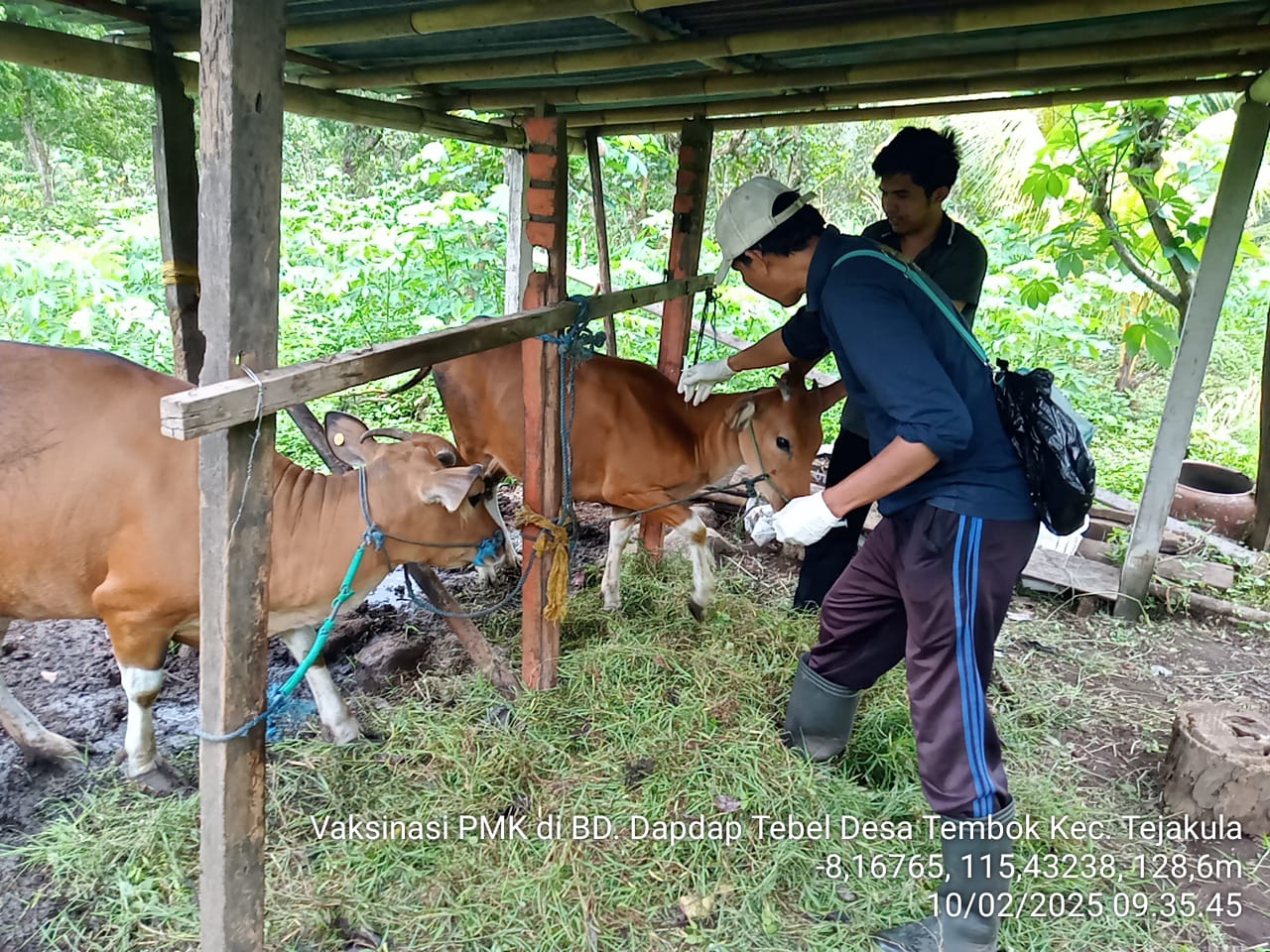 Dalam rangka mengantisifasi penyebaran penyakit mulut dan kuku (PMK) dokter hewan Kecamatan Tejakula (drh I Gede Suarsadana bersama Ketut Suardana selaku petugas sekaligus penyuluh wilbin Tembok melakukan vaksinasi PMK di Banjar Dinas Dadap Tebel Desa Tembok hari ini Senin, 10 Februari 2025.