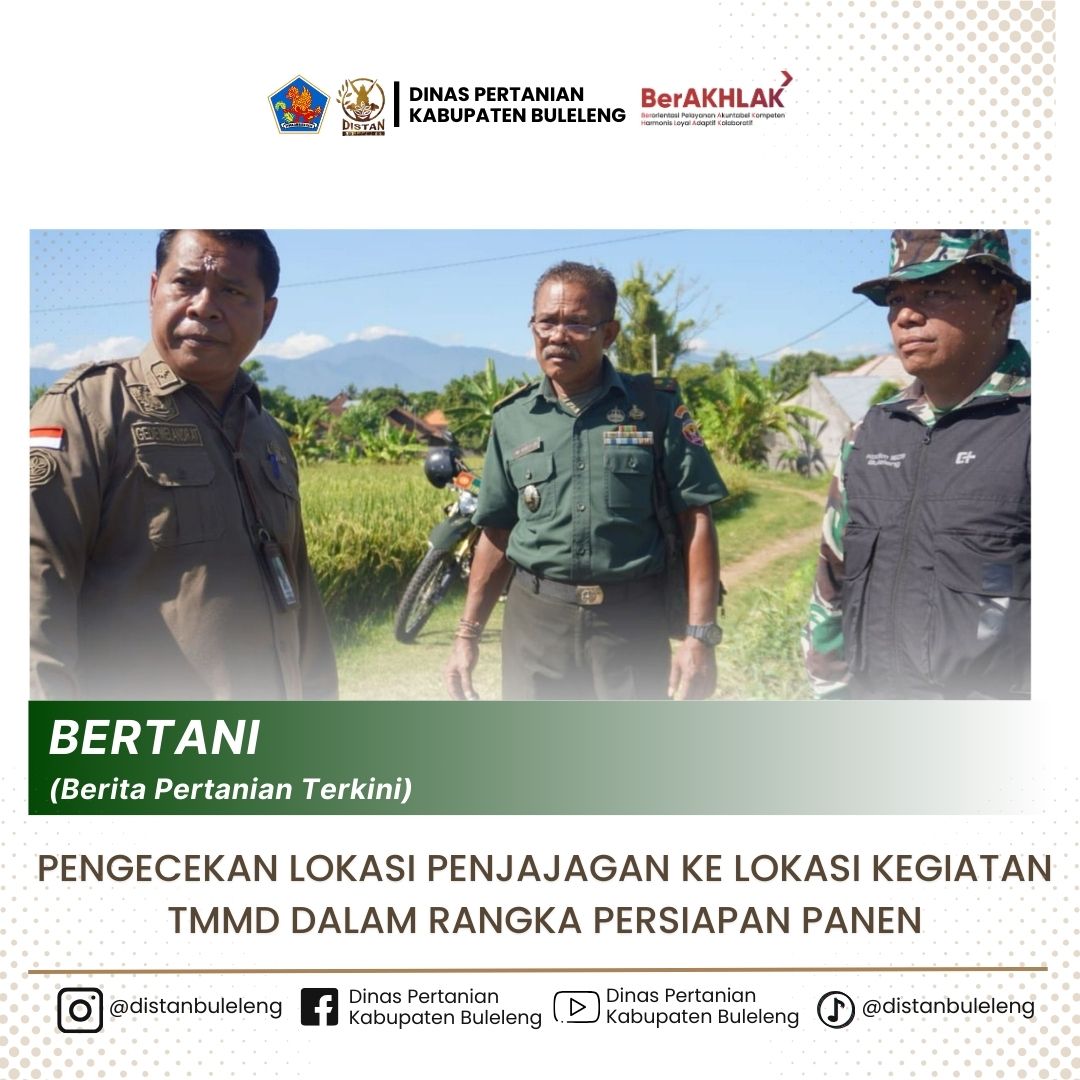 Kepala Dinas Pertanian Kabupaten Buleleng bersama Pasiter, Danramil, Babinsa Desa Sangsit serta perwakilan Dinas Pertanian, Kepala Bidang Tanaman Pangan, Penyuluh Pertanian Ahli Madya, Penyusun Teknis Budidaya dan Pengawas Mutu Hasil Pertanian ikut hadir dalam melakukan penjajagan ke lokasi kegiatan TMMD dalam rangka persiapan Panen Padi yang akan dilaksanakan pada tanggal 6 Mei 2025 di Subak Beji, Desa Sangsit, Kec. Sawan, Kabupaten Buleleng.