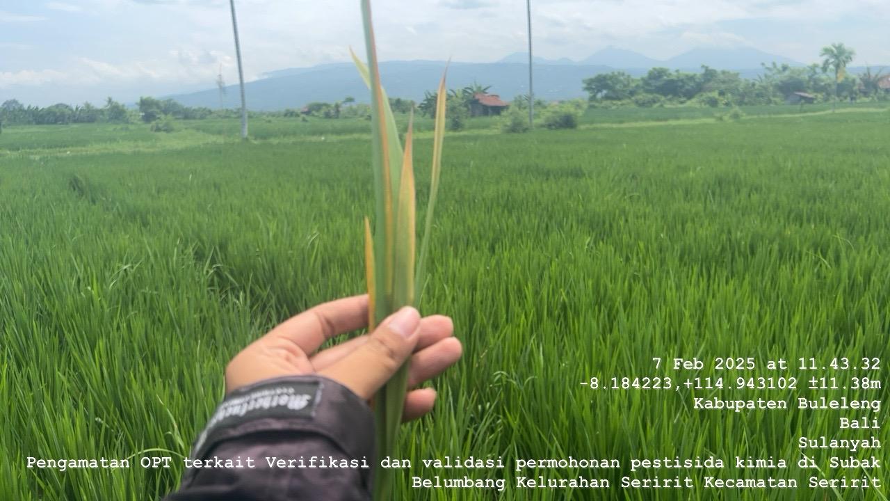 Jumat 7 Februari 2025 dilaksanakan pengamatan OPT dalam rangka verifikasi dan validasi terkait permohonan bantuan pestisida kimia guna mengendalikan OPT Wereng Batang Coklat pada Tanaman Padi di Subak Timbul Desa Kedis Kecamatan Busungbiu sesuai dengan surat dari koordinator Kecamatan Busungbiu Nomor Nomor 521/3/BSB/2025 tanggal 6 Pebruari 2025 dan OPT Kresek di Subak Belumbang Kelurahan Seririt Kecamatan Seririt sesuai dengan surat permohonan dari Koordinator Kecamatan Seririt 521. 42/16/BPP/2025 tanggal 3 Pebruari 2025.