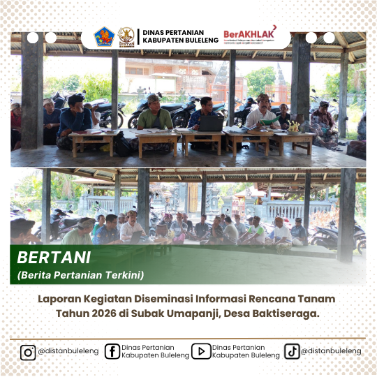 Pada hari Rabu, tanggal 1 Oktober 2025, telah dilaksanakan kegiatan diseminasi informasi mengenai rencana tanam tahun 2026 di wilayah Subak Umapanji, Desa Baktiseraga. Kegiatan ini bertujuan untuk memberikan pemahaman dan sosialisasi kepada para petani dan anggota subak mengenai rencana serta strategi penanaman yang akan diterapkan pada musim tanam mendatang.
