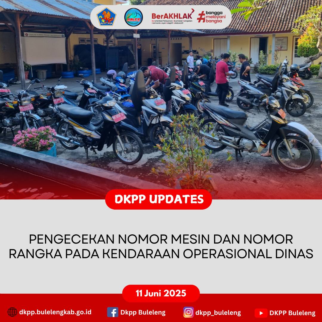 Rabu, 11 Juni 2025 - Tim Aset Dinas Ketahanan Pangan dan Perikanan (DKPP) Kabupaten Buleleng melakukan pengecekan Nomor Mesin dan Nomor Rangka pada seluruh kendaraan operasional dinas yang nantinya akan dilaporkan kepada Bidang Pengelolaan Barang Milik Daerah BPKPD Buleleng.