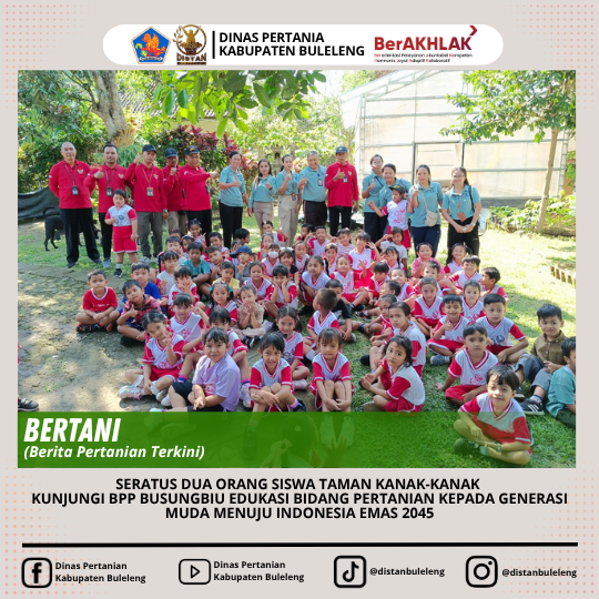 Pelaksanaan kegiatan edukasi para siswa/siswi PAUD Negeri Percontohan Kabupaten Buleleng di Busungbiu, oleh Balai Penyuluhan Pertanian Kecamatan Busungbiu berdasarkan Permohonan Surat Ijin berkunjung dari Kepala PAUD Negeri Percontohan Nomor : 0125/PAUD.N.PRCTH/BLL/X/2025 tanggal 13 Oktober 2025. Yang ditujukan Pada Koordinator Petugas Pertanian Kecamatan Busungbiu maka Pada hari ini Rabu tanggal 15 Oktober 2025 bertempat di halaman BPP. Busungbiu telah kami lakukan bersama para Petugas Pertanian Kecamatan Busungbiu berlangsung dari pukul 08.00 S/d 09.30 Wita.