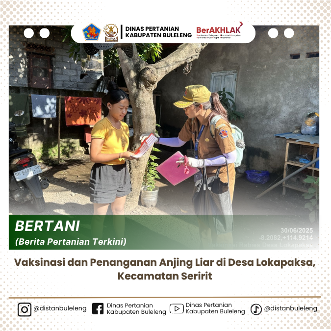 Dinas Pertanian Kabupaten Buleleng melalui Medik Veteriner Bidang Peternakan dan Kesehatan Hewan melaksanakan kegiatan vaksinasi rabies dan penanganan anjing liar di Desa Lokapaksa, Kecamatan Seririt. Kegiatan ini dipimpin langsung oleh Kepala Dinas Pertanian Kabupaten Buleleng, dan turut dihadiri oleh Kepala Desa Lokapaksa, Babinsa, Bhabinkamtibmas,Tisira serta tokoh masyarakat setempat. 30 Juni 2025