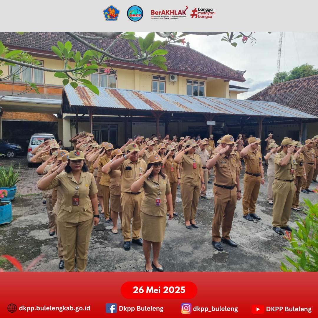 Senin, 26 Mei 2025 - Apel Pagi Dinas Ketahanan Pangan dan Perikanan (DKPP) Kabupaten Buleleng dalam rangka menjaga sikap kedisplinan di lingkungan Instansi Pemerintahan yang dipimpin Kepala Dinas (I Gede Putra Aryana, S.Sos., M.A.P.) dan diikuti seluruh jajaran. Kadis DKPP Buleleng menyampaikan beberapa hal, yaitu terima kasih dan apresiasi kepada jajaran yang dapat hadir lengkap pada apel ini. Ditengah cuaca buruk yang tidak menentu, mudah mudahan seluruh jajaran tidak ada yang terdampak bencana dan selalu berhati hati.