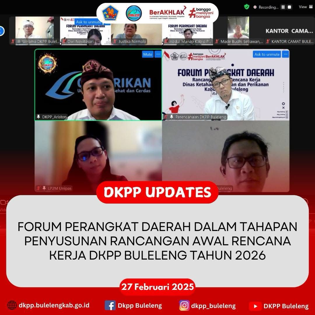Kamis, 27 Februari 2025 - Dinas Ketahanan Pangan dan Perikanan (DKPP) Kabupaten Buleleng menyelenggarakan Zoom Meeting Forum Perangkat Daerah dalam rangka memenuhi tahapan Penyusunan Rancangan Awal Rencana Kerja DKPP Buleleng Tahun 2026.