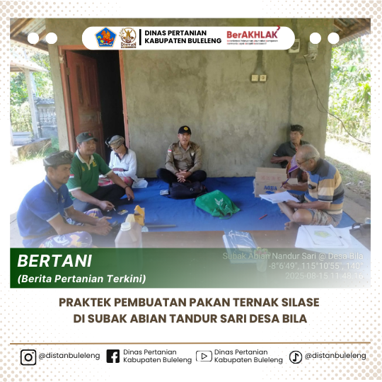 Pada hari ini Jumat,15 Agustus 2025,telah dilakukan kegiatan praktek pembuatan pakan ternak berupa silase,kegiatan pada hari ini dihadiri oleh koordinator BPP Kubutambahan, PPL wilbin Bila,serta pengurus dan anggota Subak Abian Tandur Sari,bahan yang dimanfaatkan untuk pembuatan silase pada hari ini adalah: hijauan pakan ternak ( HPT ) berupa rumput King grass dan rumput Pakchong,Dedak,molasse,dengan perbandingan: Dedak 3 - 5 % dari berat hijauan