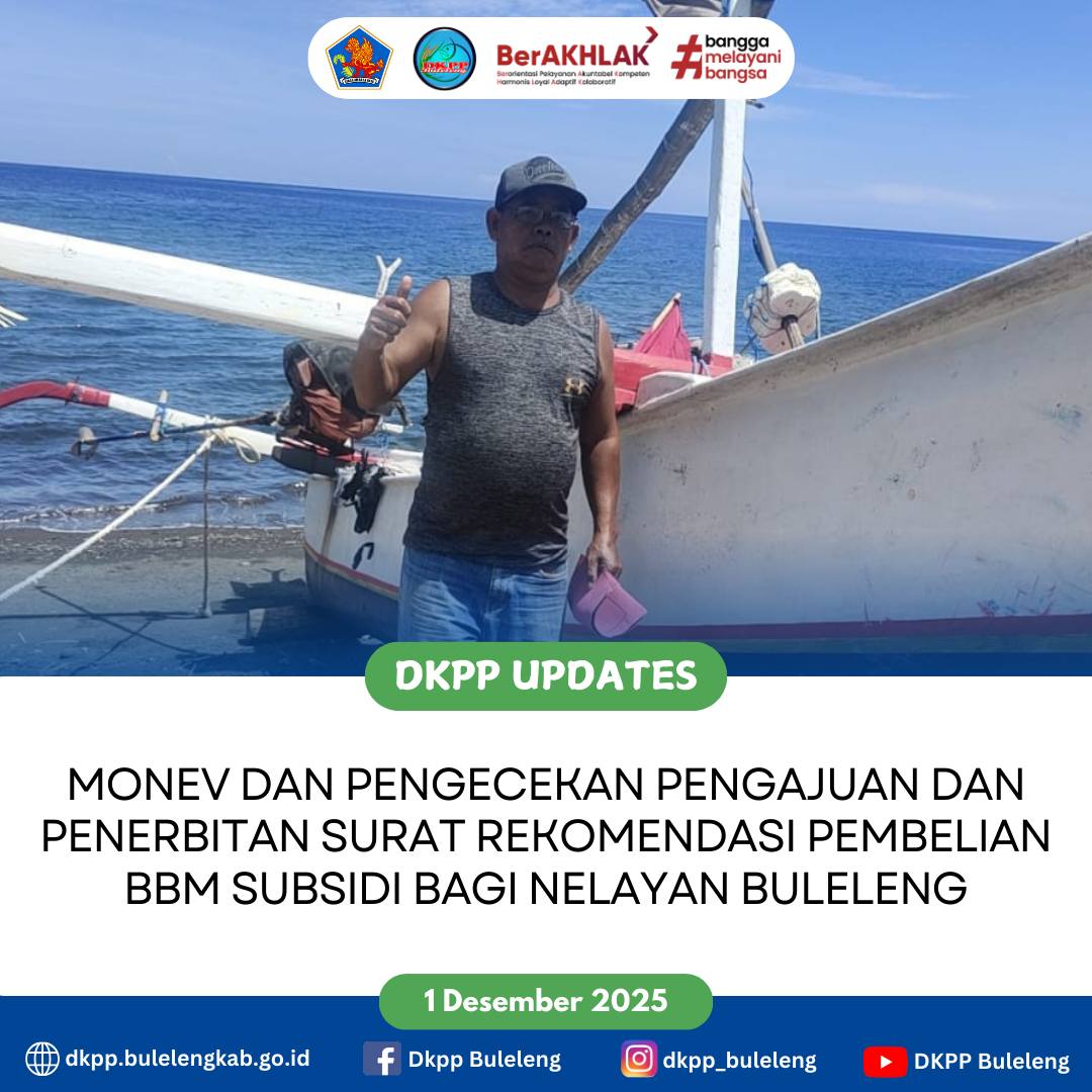 Dinas Ketahanan Pangan dan Perikanan (DKPP) Kabupaten Buleleng melalui Bidang Produksi Perikanan melakukan monev dan pengecekan lapangan terkait pengajuan dan penerbitan surat rekomendasi pembelian BBM subsidi untuk nelayan di Kelompok Usaha Bersama (KUB) Manik Segara Desa Pengastulan, Kecamatan Seririt. Senin (1/12)