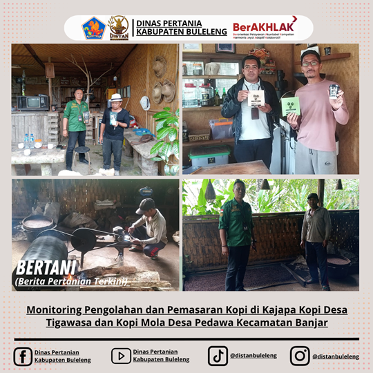 Pada hari Kamis, 13 November 2025, Bidang Perkebunan melaksanakan monitoring pengolahan dan pemasaran kopi di Kajapa Kopi Desa Tigawasa dan Kopi Mola Desa Pedawa Kecamatan Banjar. Kegiatan ini dilaksanakan oleh Kabid Perkebunan dan Administrasi Perkantoran Bidang Perkebunan. Tujuan kegiatan ini adalah untuk memantau proses pengolahan kopi dari panen, pasca panen, fermentasi, pengolahan dan pengemasan dilaksanakan untuk menjaga kualitas dan konsistensi produk olahan kopi. Selain itu dari segi pemasaran untuk mengetahui strategi pemasaran dan distribusi olahan kopiu untuk meningkatkan daya saing dan memperluas pasar kopi olahan.