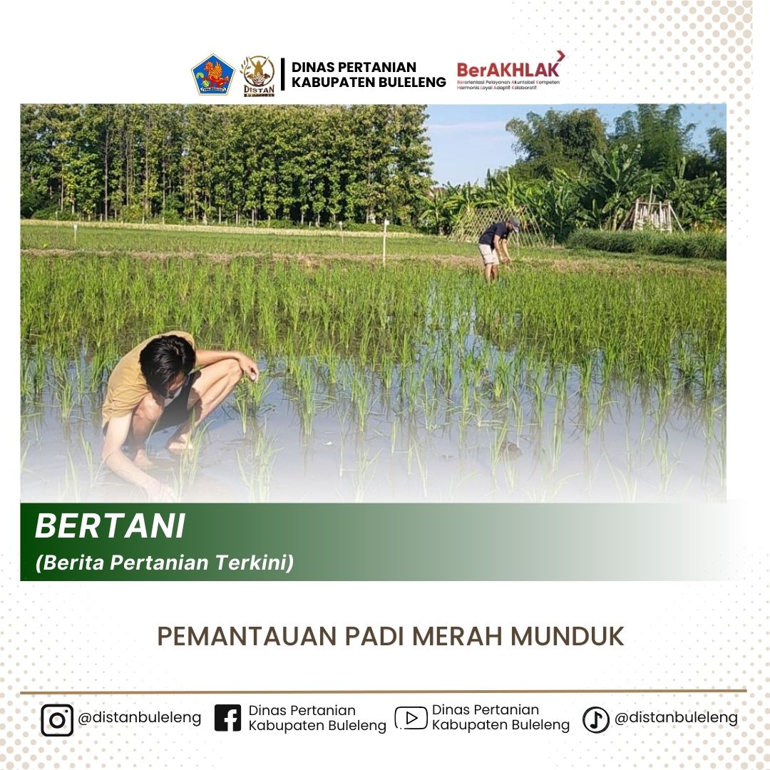 Minggu 4 Mei, Distan Buleleng melaksanakan kegiatan pemantauan di lahan padi merah Munduk yang berlokasi di eks Hutan Kota, Kelurahan Banyuasri dengan umur tanaman 17 HST.