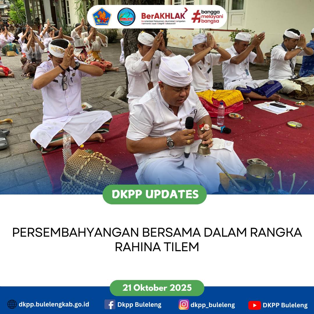 Anggara, 21 Oktober 2025 - Persembahyangan bersama jajaran Dinas Ketahanan Pangan dan Perikanan (DKPP) Kabupaten Buleleng dalam rangka Rahina Tilem. Tilem merupakan hari baik untuk memuja dan memohon anugerah kepada Sang Hyang Surya. Selain melakukan persembahyangan, umat Hindu juga dapat membersihkan diri baik lahir maupun batin.