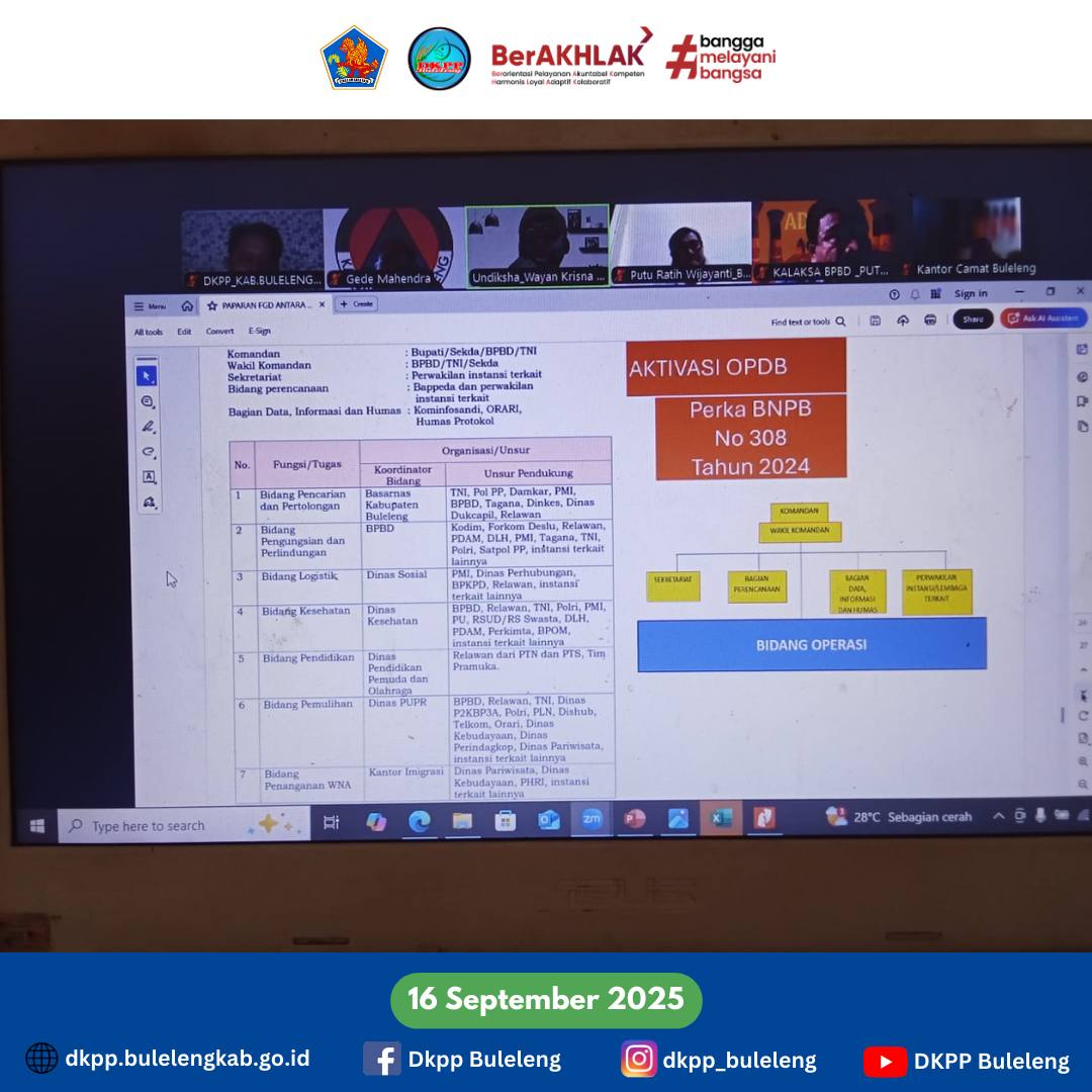 Selasa, 16 September 2025 - Dinas Ketahanan Pangan dan Perikanan (DKPP) Kabupaten Buleleng mengikuti Zoom Meeting Laporan Hasil Pelaksanaan Focus Group Discussion (FGD) Penyusunan Dokumen Rencana Kontingensi Kekeringan di Kabupaten Buleleng Tahun 2026 - 2028. Zoom Meeting ini dipimpin oleh Kepala Pelaksana BPBD Buleleng.