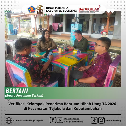 Pada hari Selasa, 27 Januari 2026, telah dilaksanakan kegiatan verifikasi kelompok calon penerima bantuan hibah uang Tahun Anggaran 2026 di Kabupaten Buleleng. Salah satu lokasi verifikasi dilaksanakan pada Kelompok Tani Ternak Sang Cempaka yang berlokasi di Desa Bulian, Kecamatan Kubutambahan.