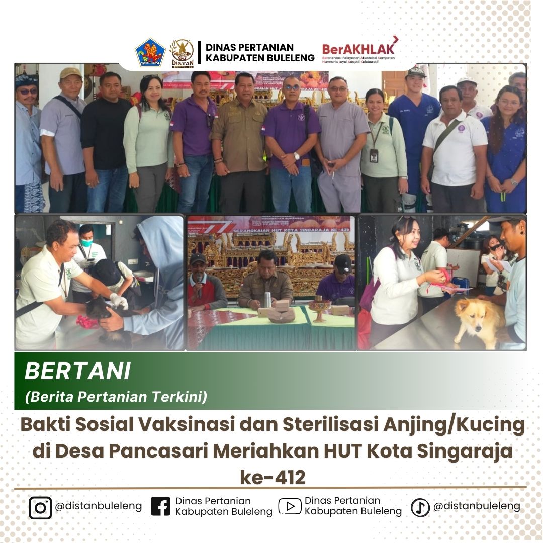 Singaraja, 5 April 2025 – Dalam rangka memperingati Hari Ulang Tahun (HUT) Kota Singaraja yang ke-412, Dinas Pertanian Kabupaten Buleleng bekerja sama dengan Perhimpunan Dokter Hewan Indonesia (PDHI) Korwil Buleleng menggelar kegiatan bakti sosial berupa vaksinasi dan sterilisasi anjing/kucing di Desa Pancasari, Kecamatan Buleleng, Kabupaten Buleleng,