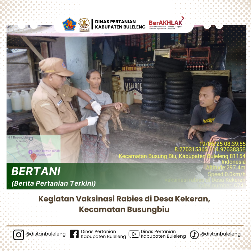 Salah satu kegiatan pencegahan dalam pengendalian penyebaran penyakit rabies pada hewan peliharaan telah dilaksanakan pada hari ini Senin, 19 Mei 2025. Kegiatan vaksinasi rabies di Desa Kekeran, Kecamatan Busungbiu. Sebaran vaksinasi pada hari ini dilaksanakan oleh dokter hewan Kecamatan Busungbiu di 2 dusun, yakni Dusun Kauhan dan Dusun Kanginan Kegiatan vaksinasi didukung oleh pihak pemerintah Desa Kekeran, salah satunya ditandai oleh pendampingan langsung dari Tim Tisira (Tim Siaga Rabies) Desa Kekeran bersama para Kepala Dusun masing masing untuk mendampingi hingga selesai kegiatan vaksinasi hari ini. Adapun perolehan hasil vaksinasi hari ini adalah 187 ekor anjing telah tervaksin.
